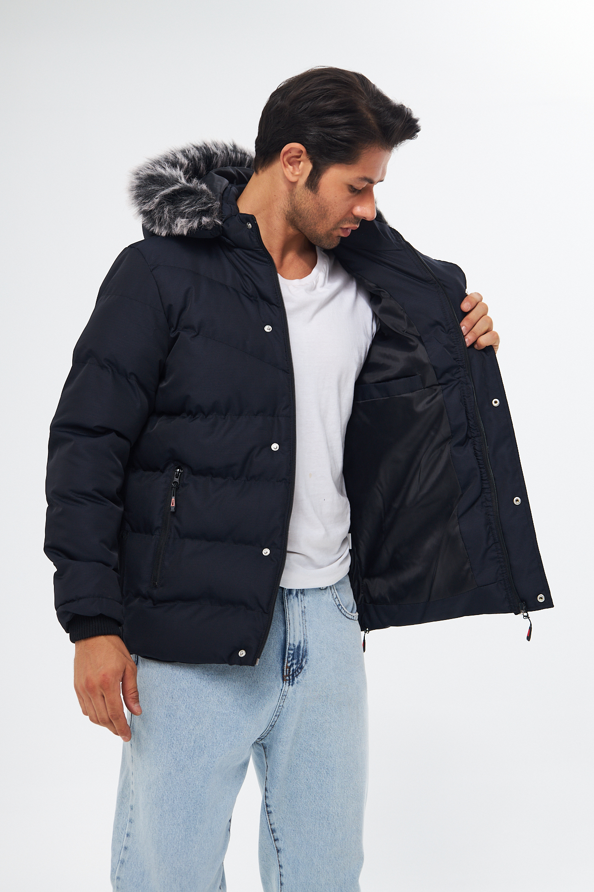کاپشن/پالتو مردانه کلاهدار سرمهای تیره با آستر خز