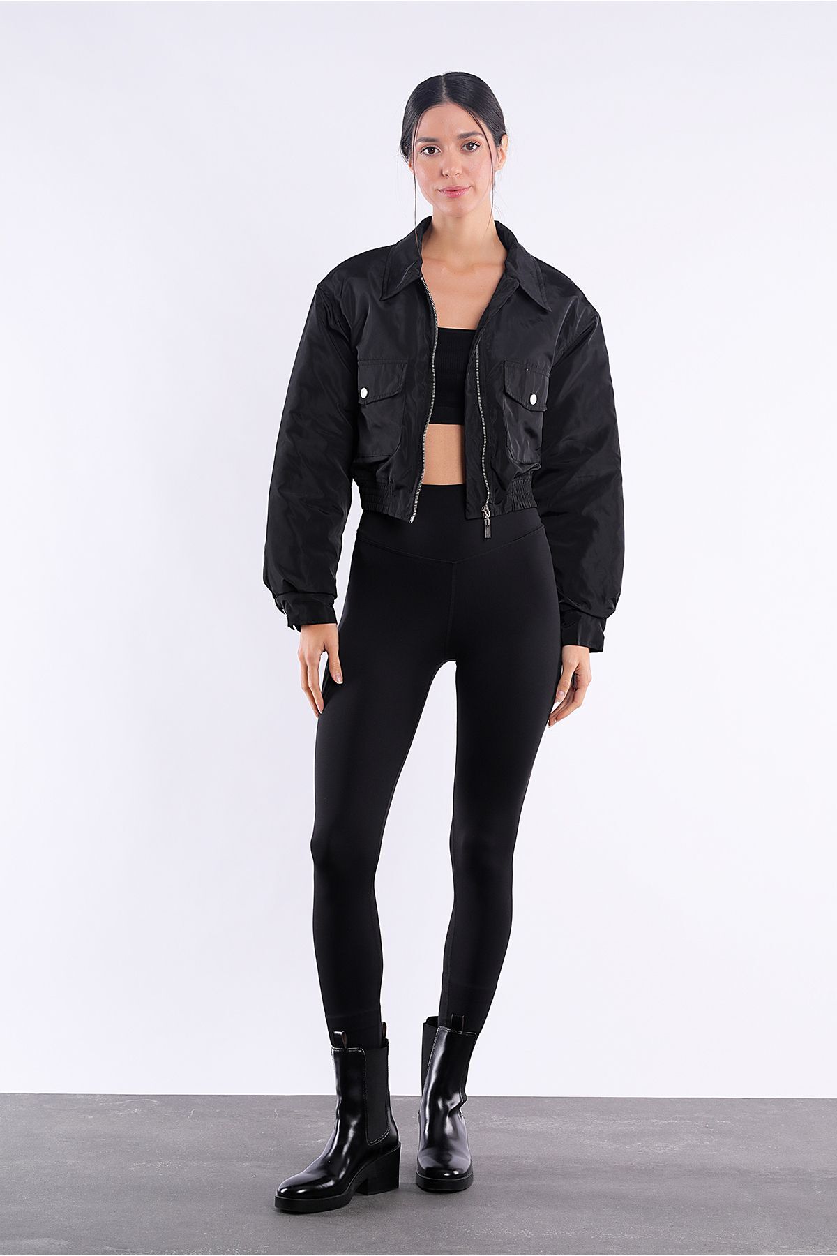 کاپشن کوتاه مشکی بمبر با جیبهای زیپدار