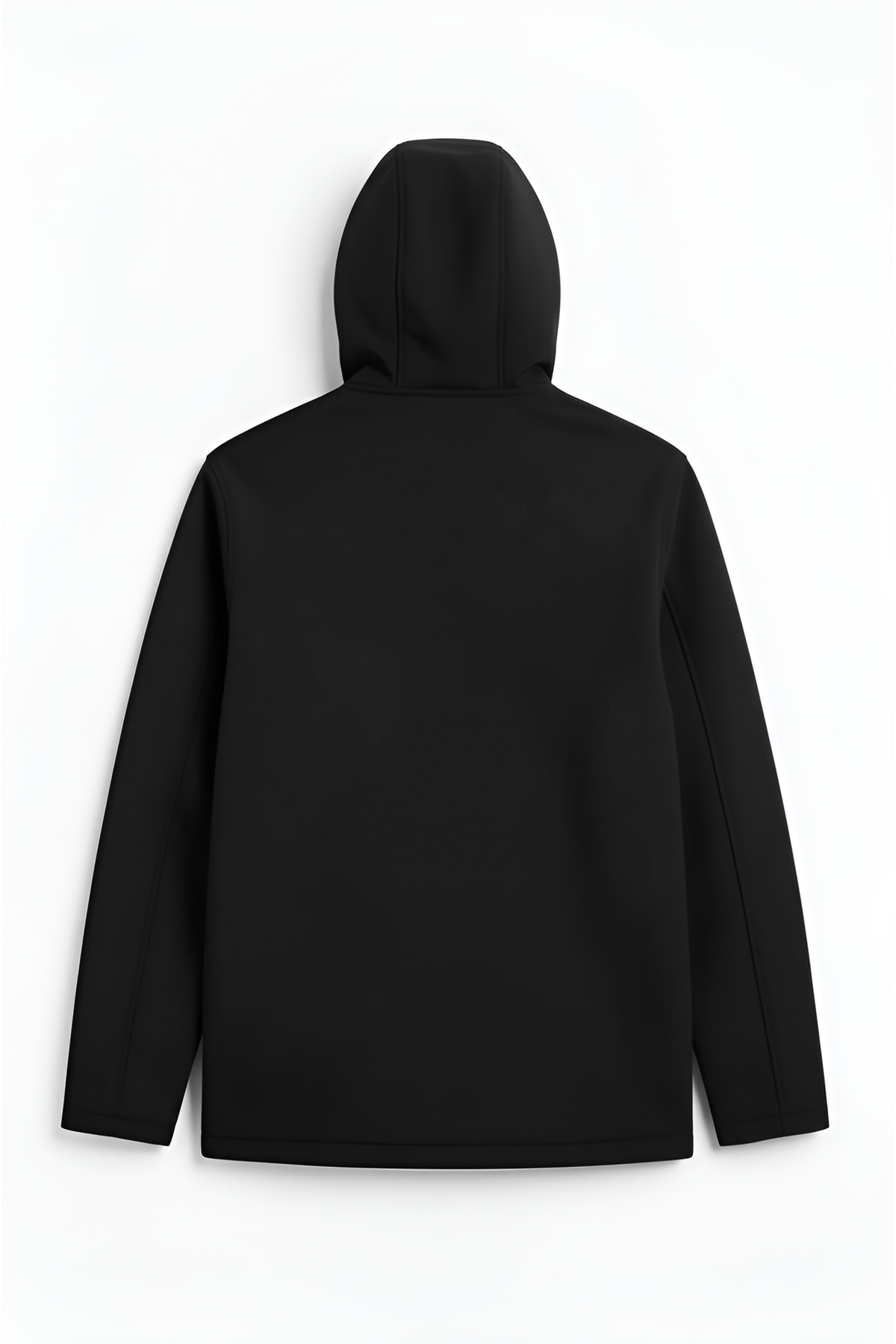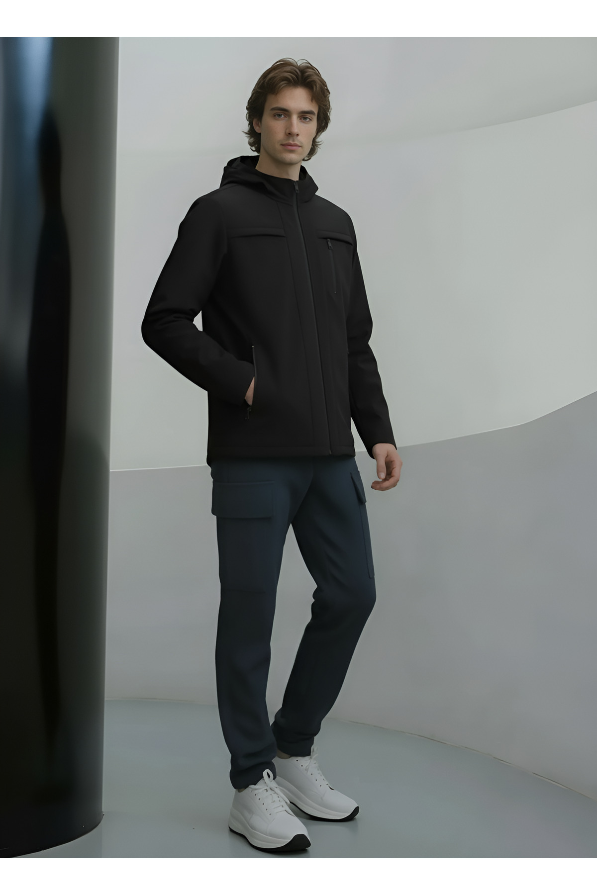 کاپشن مردانه گورتکس سافتشل مشکی ۱۰۰٪ ضد آب و باد، آستر خزدار، جیبهای داخلی زیپدار