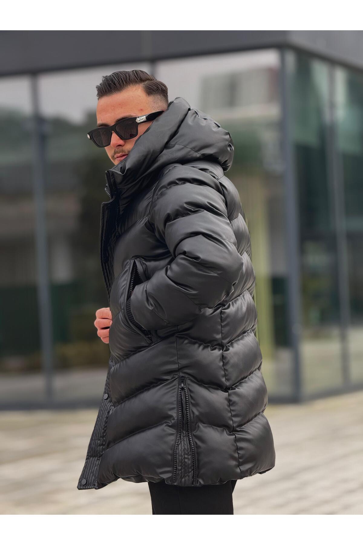 کاپشن بلند مردانه پفی با روکش چرم و کلاه