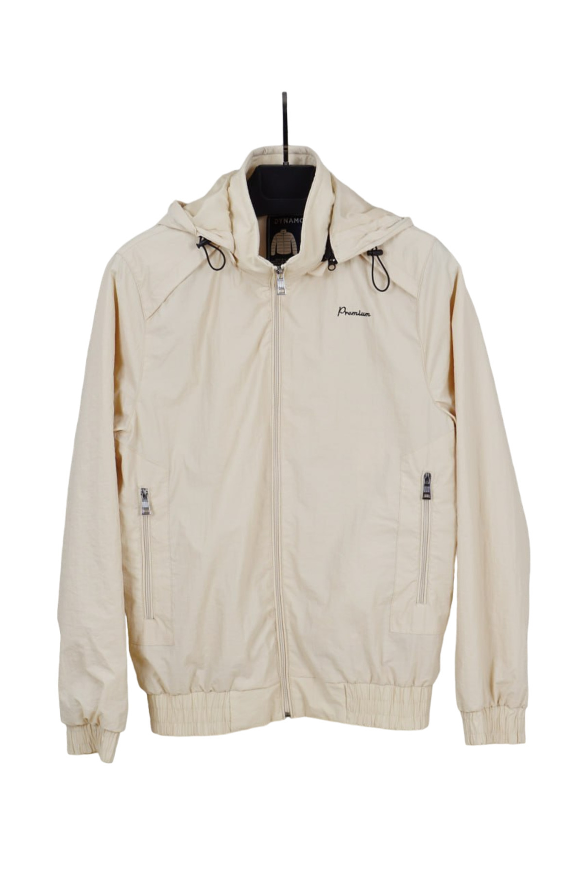 کاپشن مردانه کلاهدار جداشدنی به رنگ سنگی، جیبهای زیپدار و آستردار، بارانی نازک فصلی