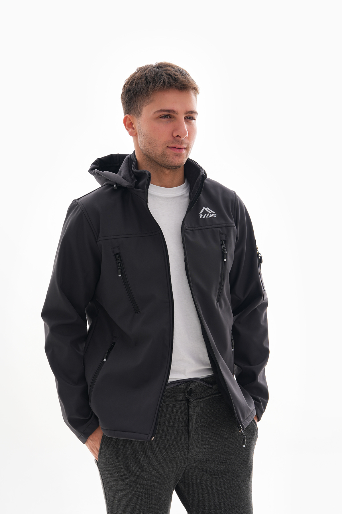 کاپشن مردانه ضد آب Softshell با کلاه زیپدار قابل جدا شدن، آستر پشمی و جیب، خاکستری تیره