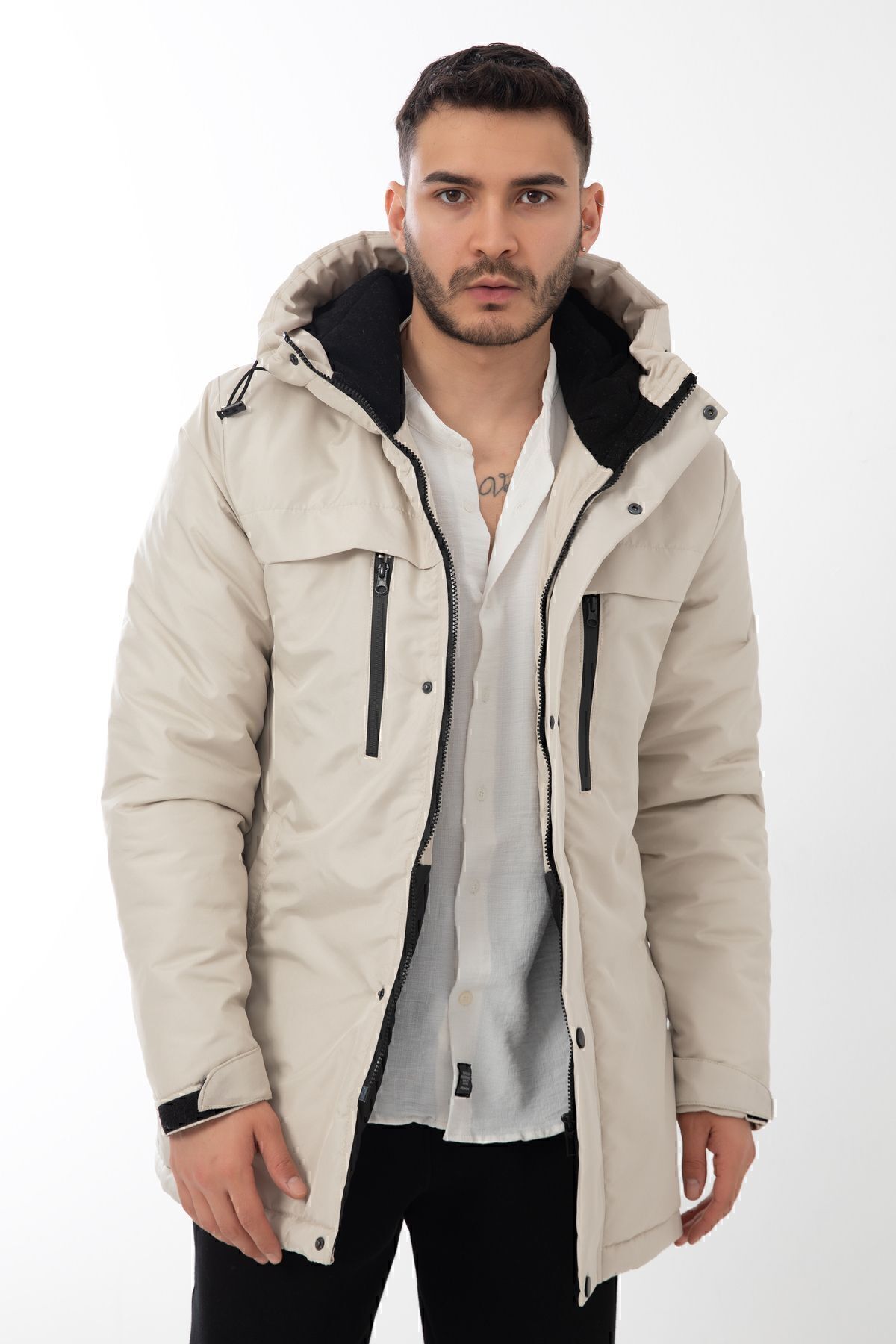 کاپشن، پالتو و پارکا اسپرت زمستانی کلاه دار مردانه، رنگ سنگ، آستر پشمی، کمر خزدار، ضد آب و باد