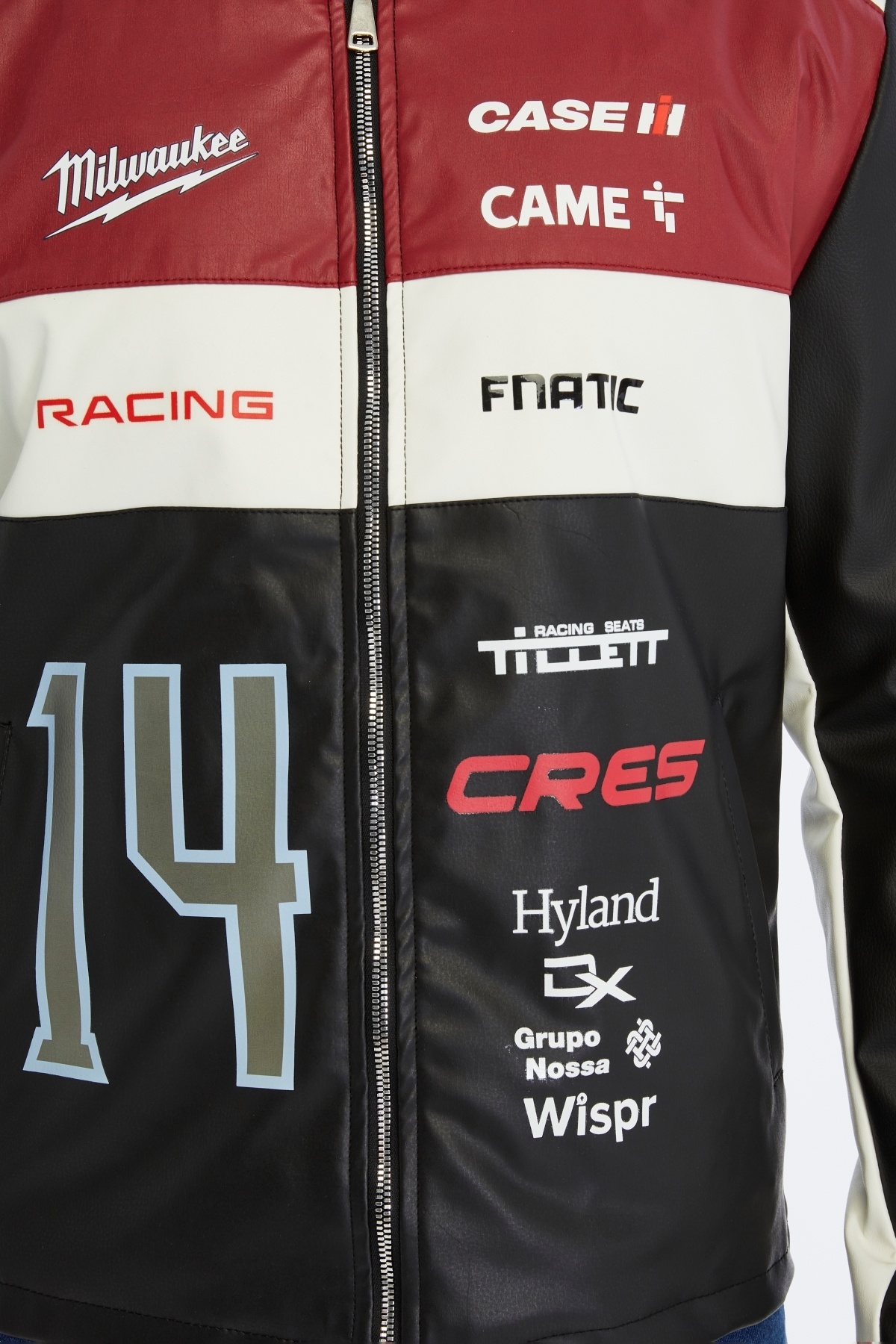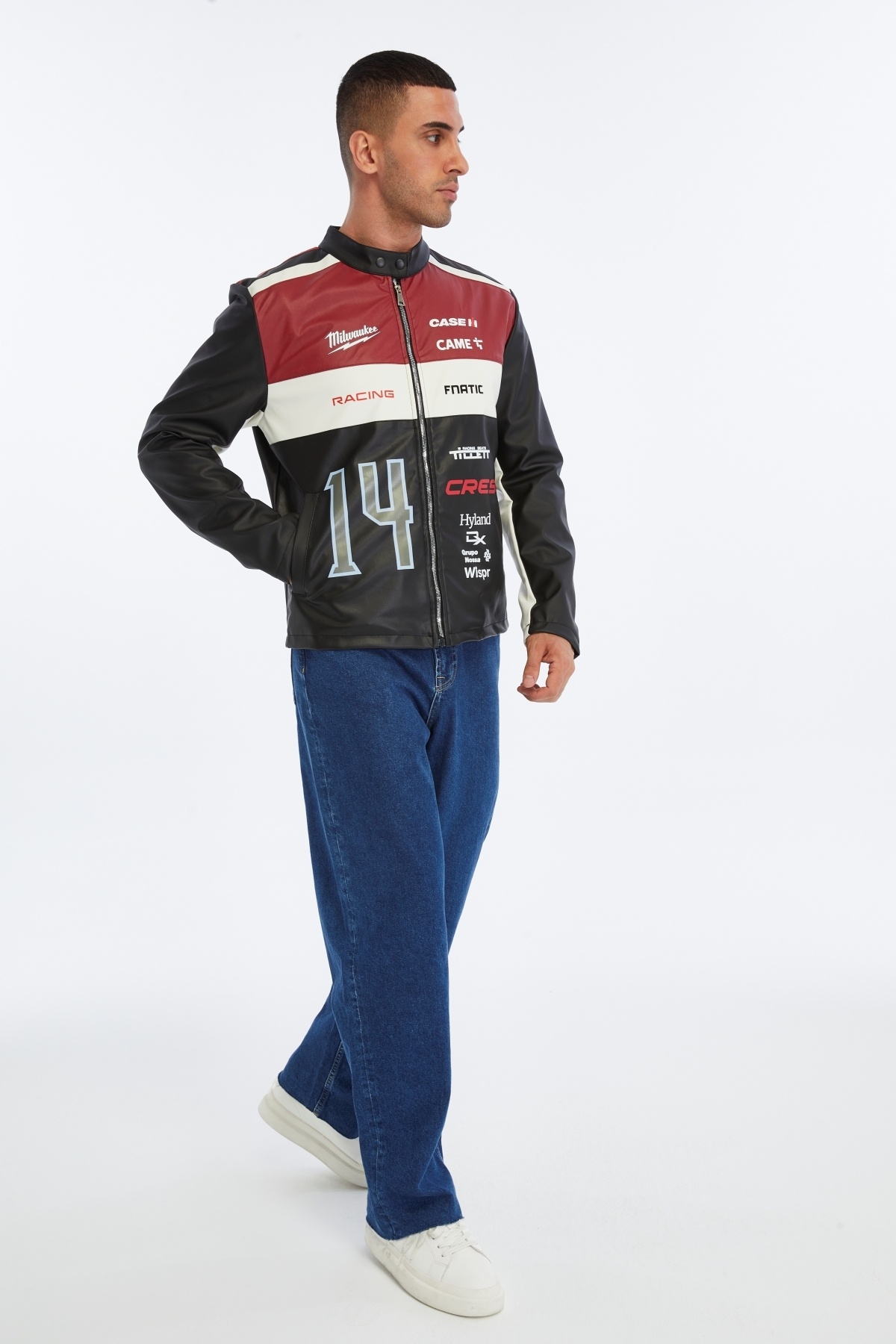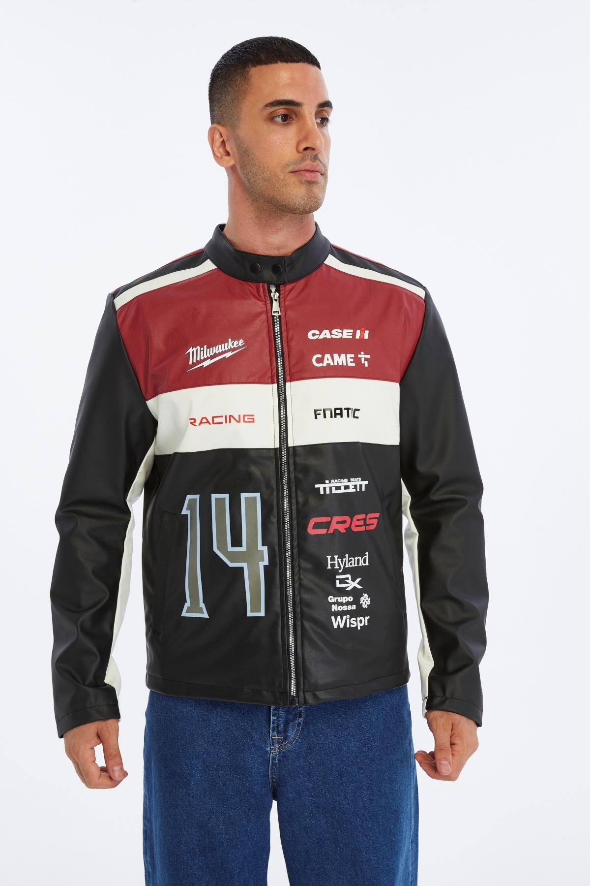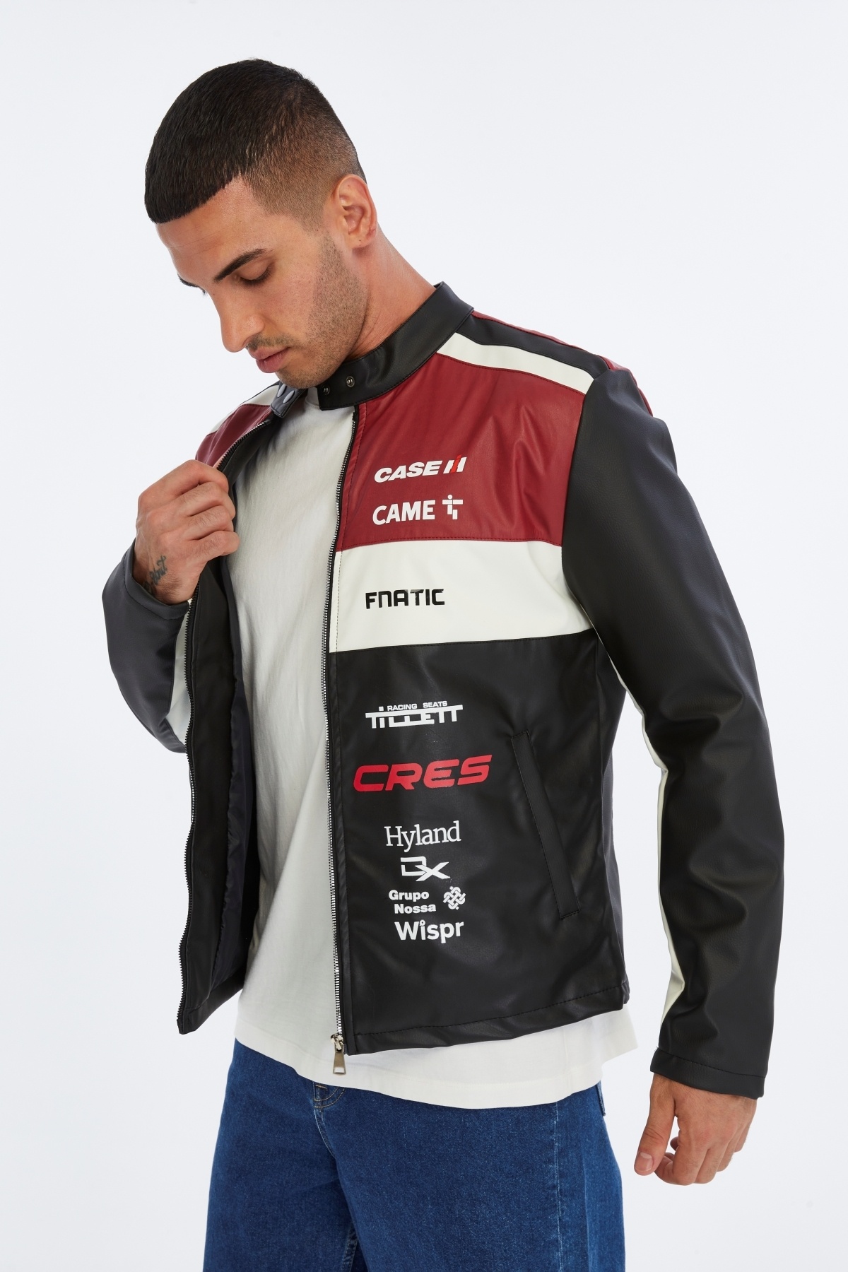 کاپشن چرمی مردانه طرح راه راه سایز بزرگ، کاپشن موتورسواری یقه ماندارین، کاپشن مسابقهای