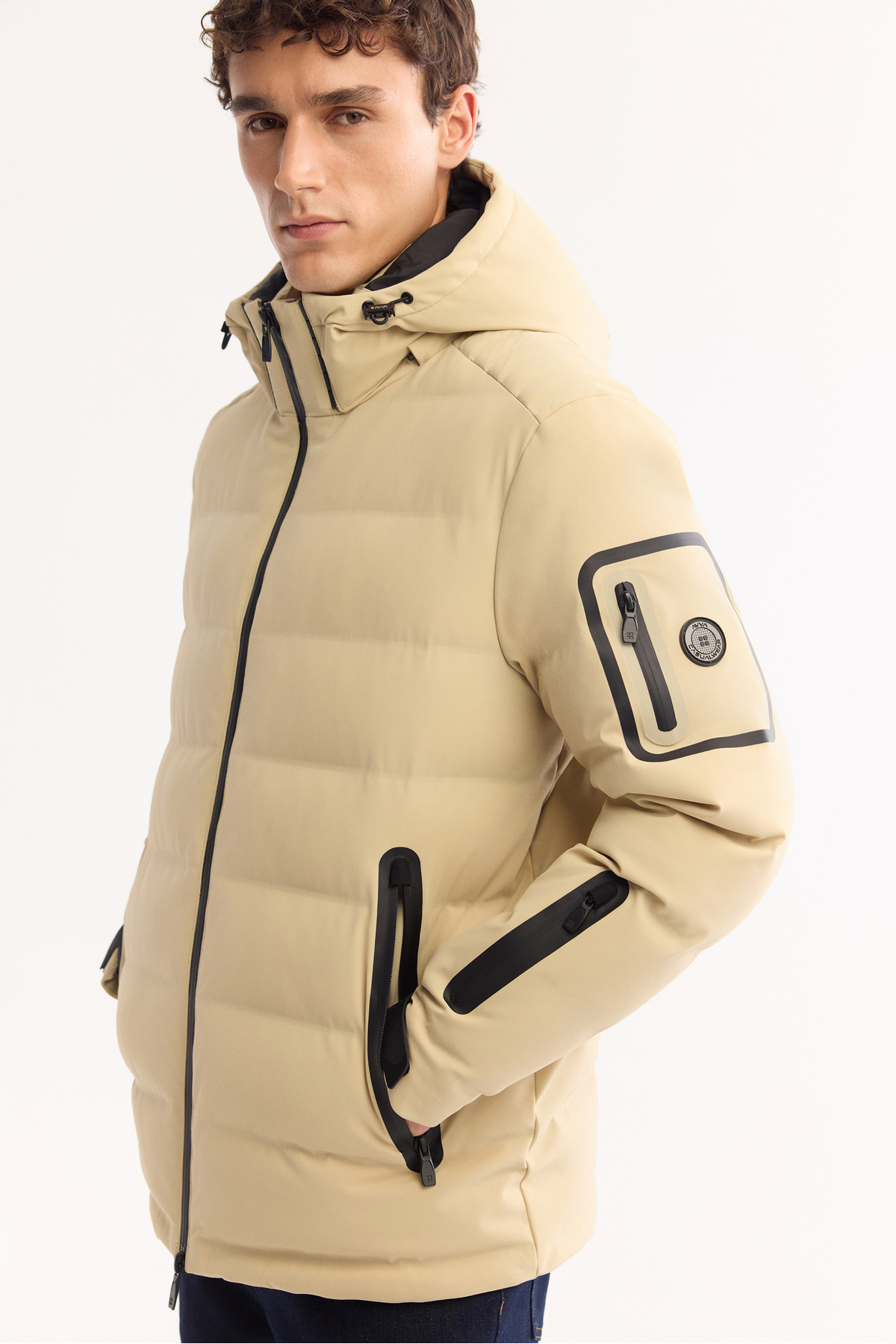 کاپشن مردانه کلاه دار بژ، ضد آب، ضد باد، مقاوم در برابر -10 درجه سانتیگراد، کاپشن پفی A52Y6067