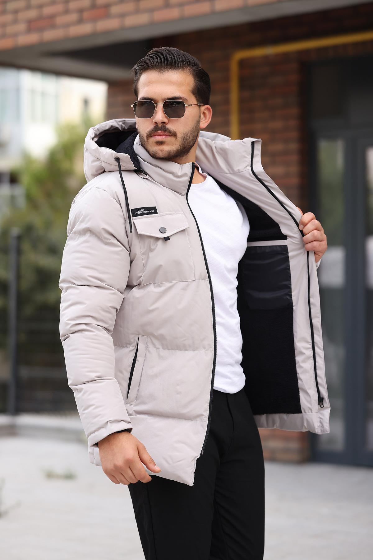 کاپشن پفی بلند با جیب روی سینه و آستر خزدار PLDP 2957_50456-1