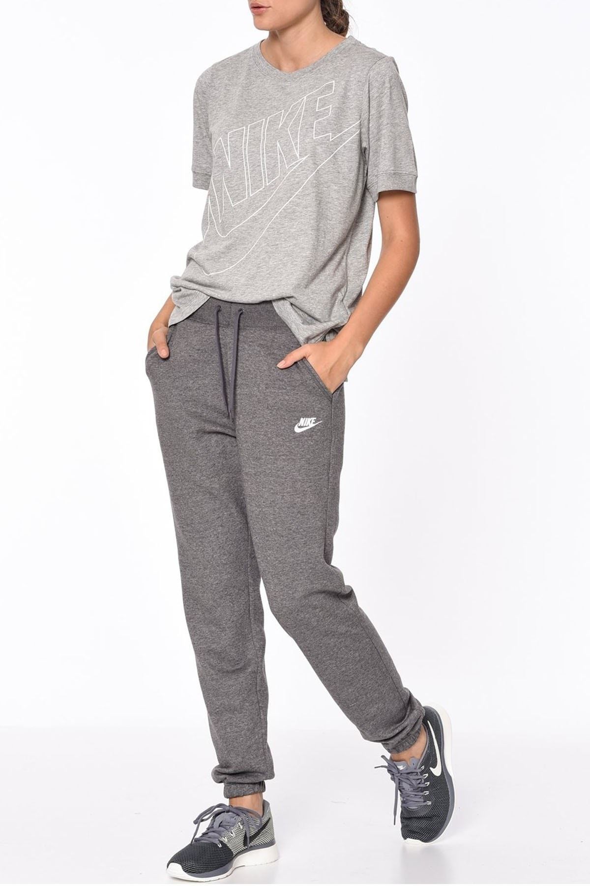 شلوار گرمکن ورزشی نایکی خاکستری | با نشانواره نایک بر روی باسن، شلوارهای ورزشی نایک زنانه ورزشی حس نرمی را به شما ارائه میدهند و شما را گرم نگه میدارند. پارچه پشمی نرم و گرم است.