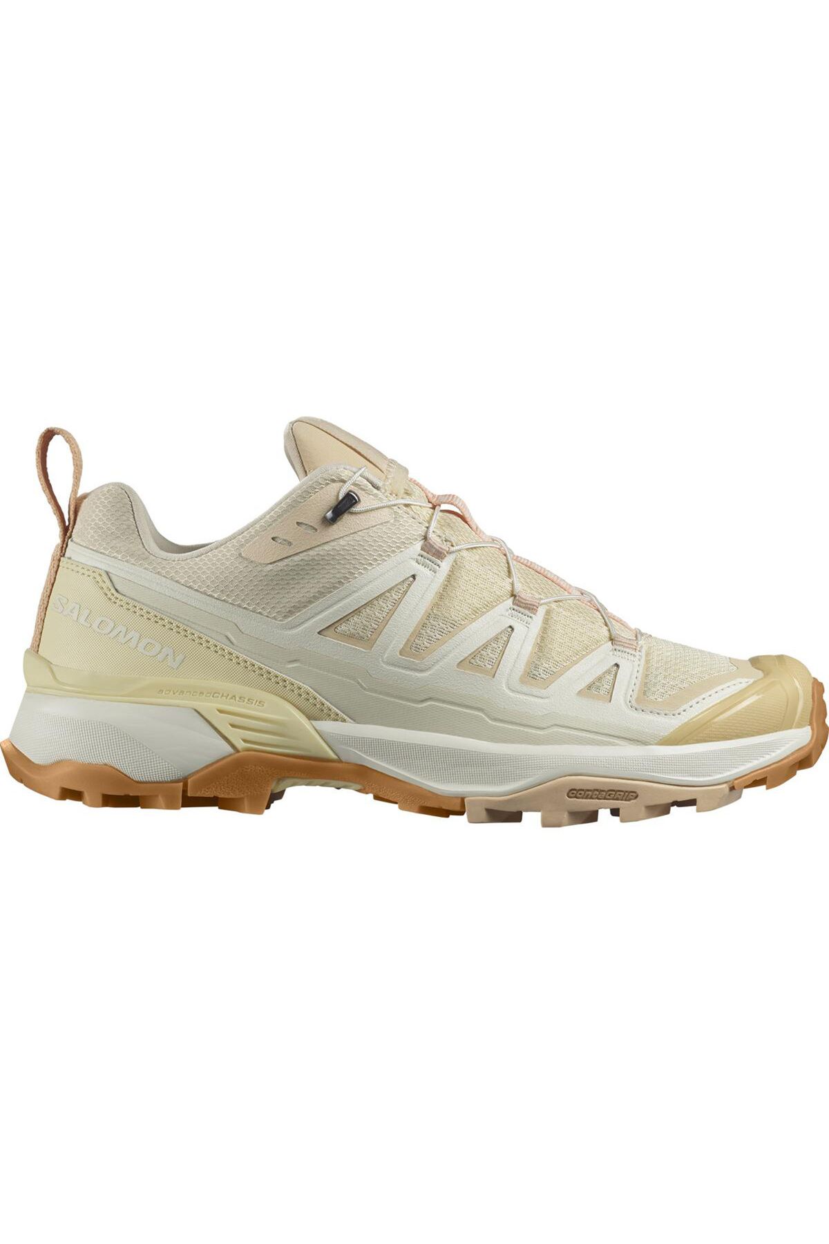 کفش سالامون طبیعت گردی سفید پارچه | کفش خارجی Salomon X Ultra 360 Edge با استفاده از بهترین دستور العمل ثابت شده و تطبیق آن برای فضای باز جدید، با تکیه بر میراث نمادهای X Ultra، در هر زمینی که می‌خواهید در آن ماجراجویی کنید، بهترین چسبندگی، ثبات و محافظت را ارائه می‌دهد. دارای زیره میانی بالشتکی و رویه پارچه ای غنی از مواد بازیافتی است. رویه Salomon X Ultra 360 Edge از مواد مصنوعی بازیافت شده، از جمله مش پارچه و لایه های تقویت شده TPU ساخته شده است. ساختار رویه سبک و منعطف است، با توری محکم بافته شده در قسمت جلویی پا. لایه‌های تقویت‌شده برای دوام بیشتر به نواحی مستعد ساییدگی مانند جعبه پنجه، پاشنه و زیره کفش اضافه شده است. زیره میانی Salomon X Ultra 360 Edge از فوم EVA ساخته شده است. احساس راحتی و بالشتکی در زیر پا دارد و بدون اینکه بیش از حد اسفنجی باشد، نسبتاً فنری و تند است. X Ultra 360 Edge دارای انعطاف پذیری زیادی در قسمت جلویی پا و حتی انعطاف پذیری بیشتری در بالای انگشتان پا است. این یک راه رفتن طبیعی و سواری راحت را در هر قدم تضمین می کند. سفتی بسیار بیشتری در دو سوم پشتی چکمه وجود دارد که باعث پایداری و استحکام زیر پا می شود. این باعث می شود که چکمه از نظر فنی در زمین های ناهموار کوهستانی احساس توانایی بیشتری داشته باشد. ویژگی ها: بسته شدن توری Quiklace