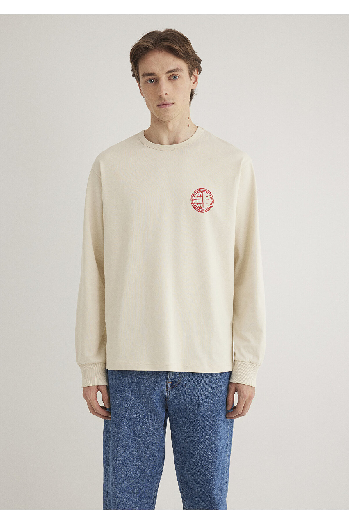 تیشرت آستین بلند طرحدار اکرو، گشاد / گشاد، راحت، برشدار، 0612725-83108