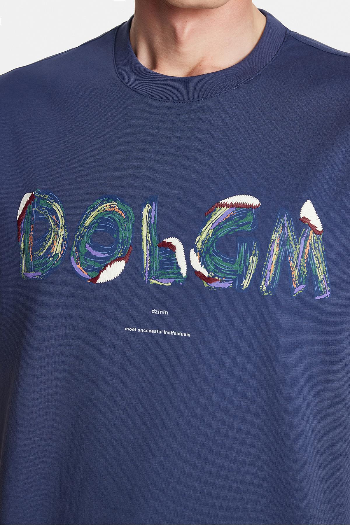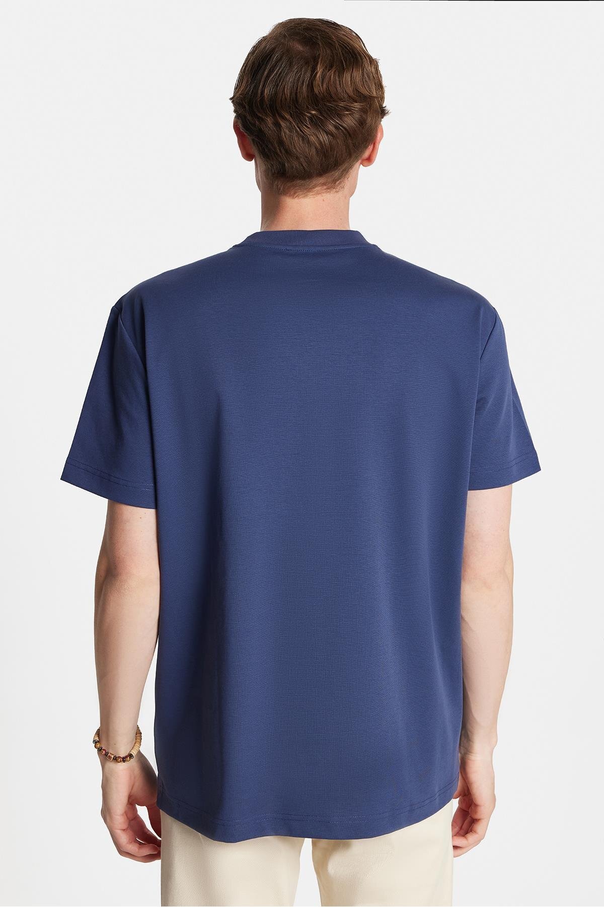 تیشرت مردانه یقه گرد نیلی طرحدار با برش راحت و طرح جلو چاپ از جنس پنبه و گلدوزی دقیق